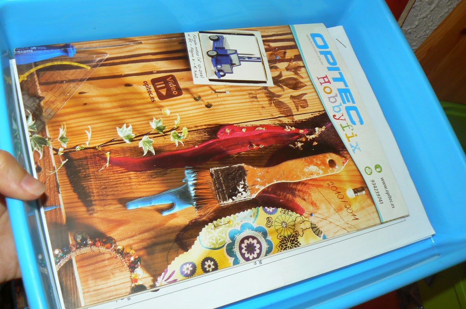 Una caja con el catálogo de Opitec porque siempre está montando o desmontando algo y de allí saca ideas.